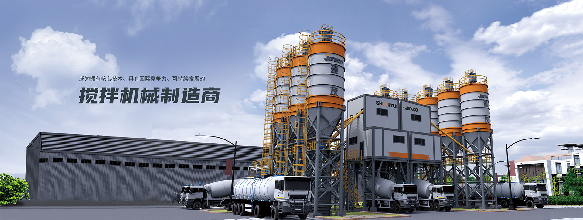山推建友機械股份有限公司主營混凝土攪拌站、瀝青攪拌站、穩定土拌合站、干混砂漿站、制砂站、破碎線、混凝土攪拌運輸車、圾處理設備及拖泵、砂石分離機等各類攪拌機械。